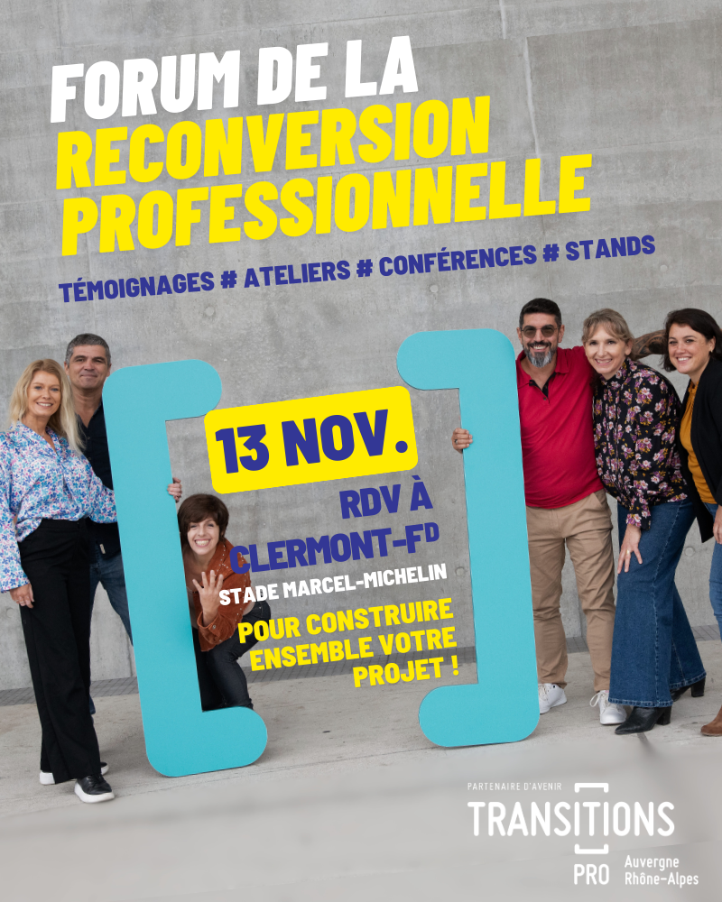 Le 13 novembre, dans le cadre de la Journée Nationale de la Reconversion, Transitions Pro vous accueille à Clermont-Ferrand pour apporter des réponses concrètes à toutes vos questions, que vous soyez déjà sûr de vous reconvertir ou encore en pleine réflexion !