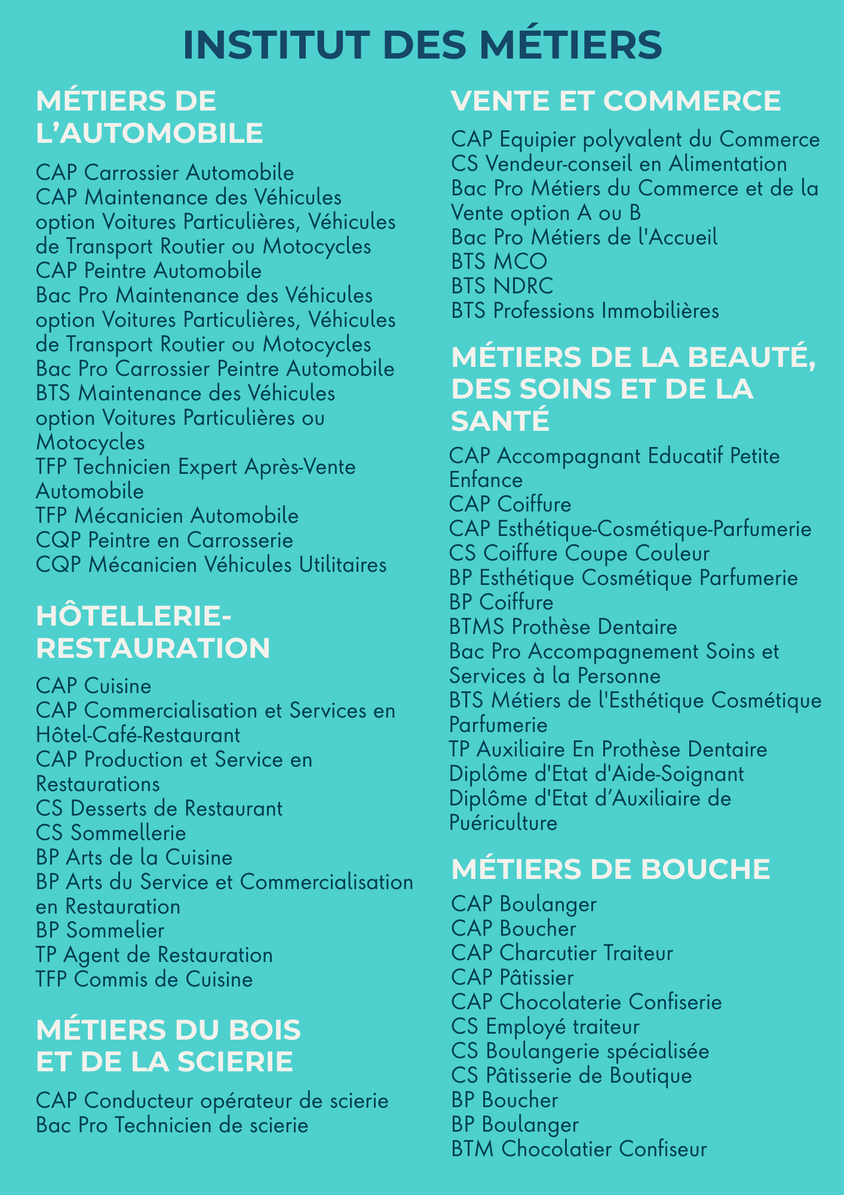 Lors de ces Journées Portes Ouvertes, les visiteurs pourront découvrir l’ensemble des formations proposées du CAP au BAC+3, réparties sur six secteurs d’activité :